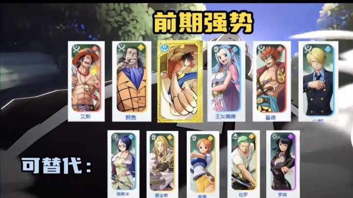 新手角色选择,新手玩家用什么角色能让你轻松开局?并且强度在线呢?游戏可以使用6名角色,3个为上战角色,3个是备选角色,在战斗中可随意切换,这里提醒兄弟们,新手阶段就可以拿到一个老沙,那么多出来的抽奖卷我们可以直接抽艾斯,给兄弟们整理下前期适用性非常高的角色,艾斯,老沙,薇薇,基德,塔希米,索隆,山治,还有我们新世界的路飞,其中老沙和路飞是稳定获取的,基德可以代替索隆,娜美可以代替薇薇,山治有特效。山治放到女性卡牌的备选位置可以帮助回血。