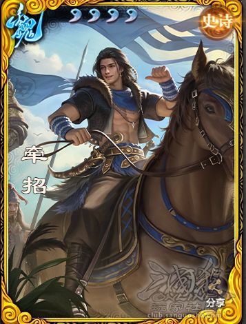 3. 综合以及补充:牵招是一个辅助和爆发的武将,武将在运气好的时候可以过很多牌,群体吃桃,群体顺手无中,牵招的技能两个技能也是有一定关联的,不过容易丢牌丢上头,自己能保命要紧① 武将单出会比较乏力了,如果组阵,可以考虑配合一个卖血武将,找锦囊,当然给牌的也行② 武将操作难度不高,主打就是心态操作③ 武将有四血,所以打起来的话防御还是可以的,不过因为武将特点需要压血,所以还是有一些脆皮的,单挑的话上不了台面,武将多目标的技能废了