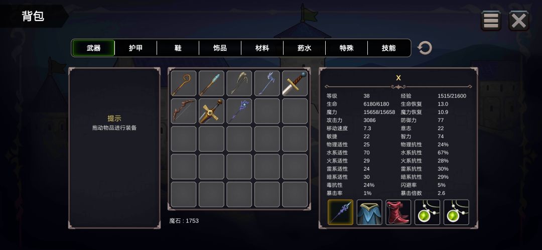 之后掉装备法杖和斗篷就装上 别的就卖了去灵域学技能