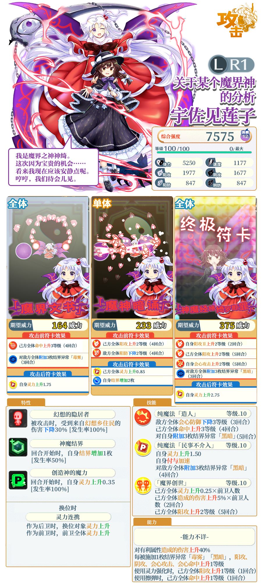 ※「[关于某个魔界神的分析]宇佐见莲子」需要使用同名伙伴或者「灵之替身」进行界限突破。不同泛异记号的伙伴及「灵之替身」外的其他替身无法对其进行界限突破。