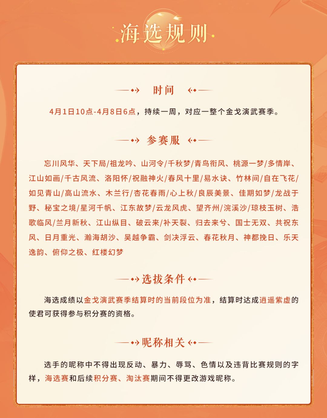 结算时达到逍遥紫虚段位的使君获得参与积分赛的资格。