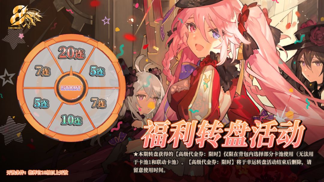 周年福利转盘活动将在更新后抵达,活动期间连续登录游戏,即可参与机体转盘活动。本次转盘活动持续20日,活动期间,每日登录参与转盘获得【高级代金券:限时】无法用于卡池1和联动卡池~
