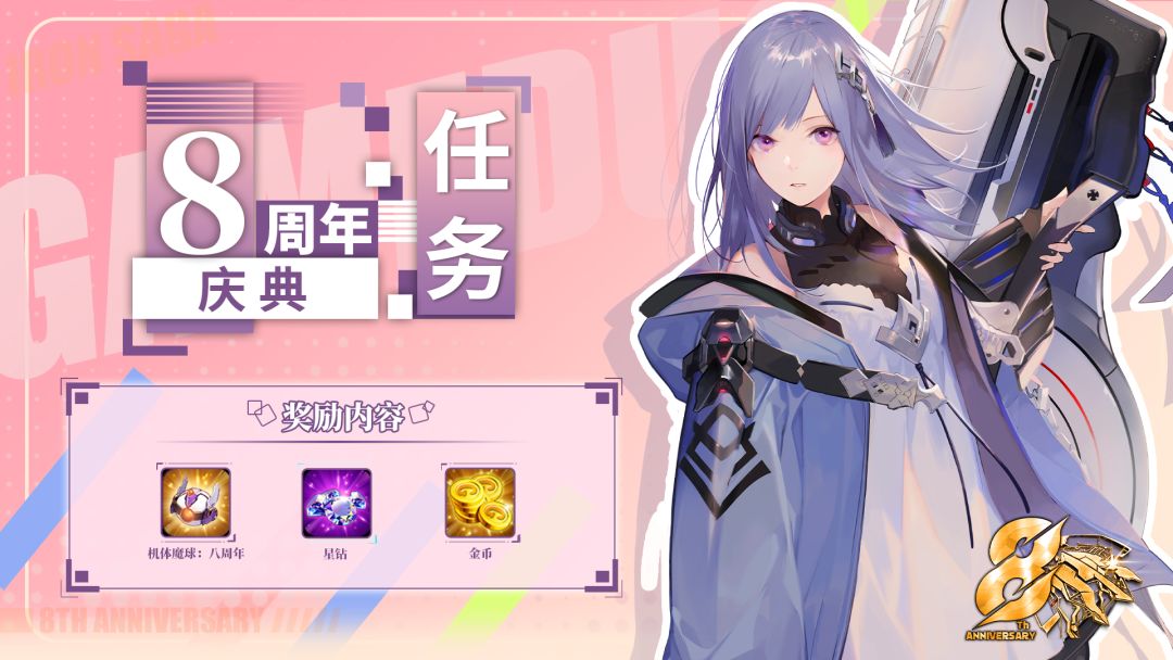 更新后,活动期间指挥官可参与完成任务可获取对应奖励,任务进度需求累计达到1000,可获得【机体魔球:八周年】、星钻等奖励。