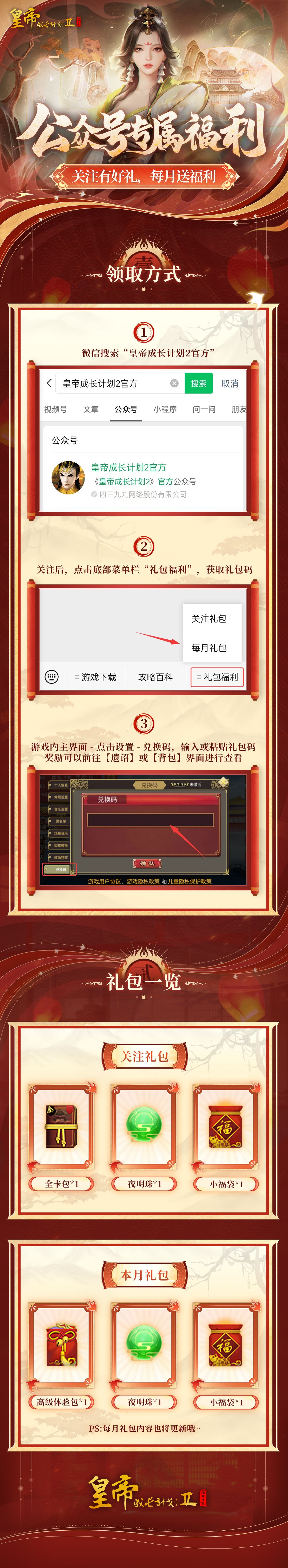公众号后续还将推送最新资讯、游戏攻略及各类福利活动,点关注不迷路,欢迎圣上们来找我们玩呀~快快前往微信搜索“皇帝成长计划2官方”并关注我们吧!