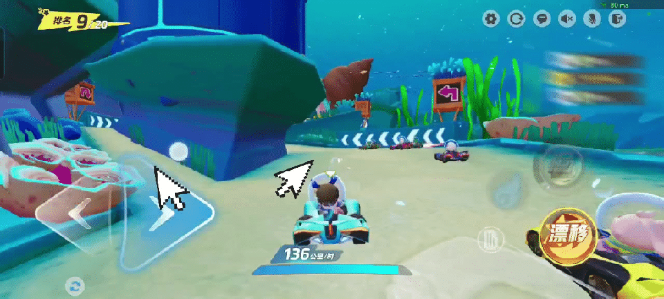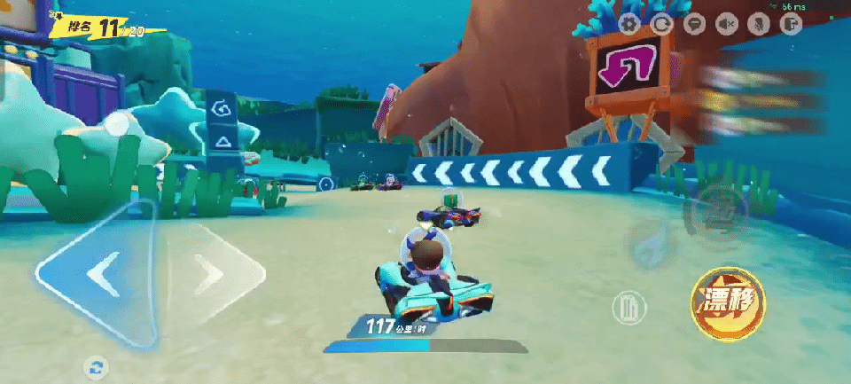 鱼群贴着头顶游过,在没有完全过弯时,氮气提供的加速效果可不太好,建议星宝驶进直道后再开启氮气,这样可以更好地保持领先地位捏~