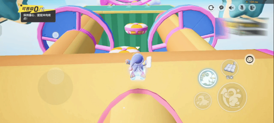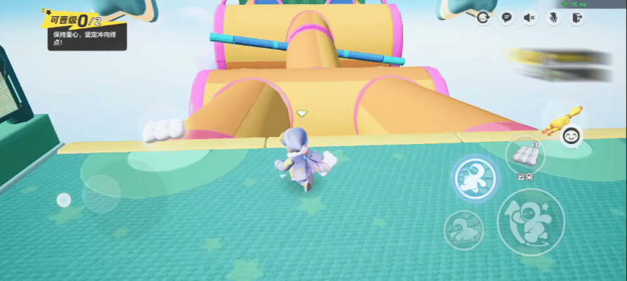 首先进入第一段赛道。星宝需要通过两段朝相反方向转动的超大滚筒区,滚筒中间悬着一个空中摆锤障碍物,星宝们可以在滚筒上不断跳跃前进,保证自己身处滚筒顶端。趁摆锤摆向滚筒两边时快速从中间通过,即可轻松抵达下一个平台啦!