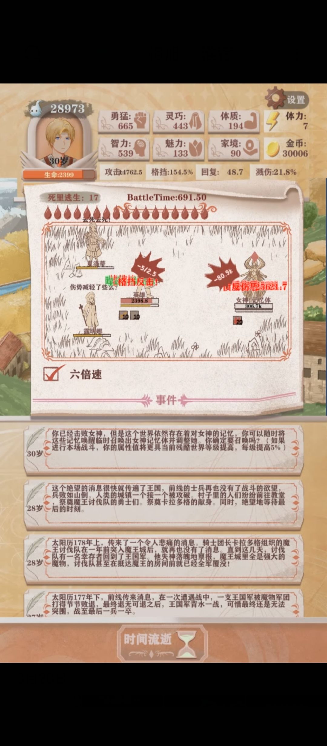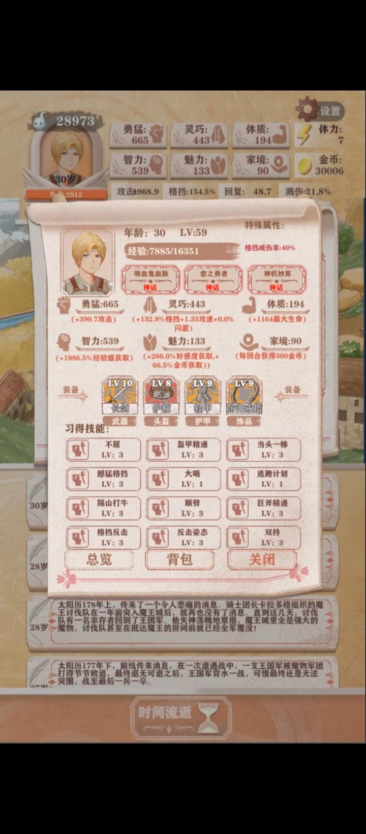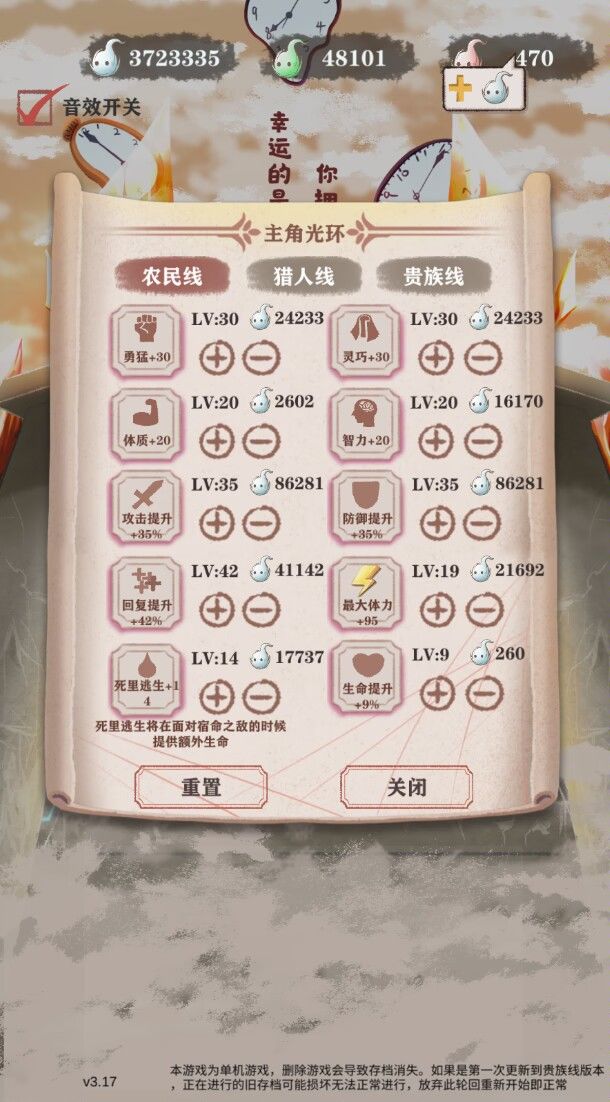 农民线这里打剑圣和女神感觉有点比较抽象,就是你打剑圣得用兴奋剂,反击姿态双持全学,但是打女神兴奋剂负提升,而且攻速的负提升影响比较长久,反击姿态和双持提升应该也是负,然后打女神必须要打剑圣拿嗜血,感觉就有点呃呃呃了,农民线,收工!