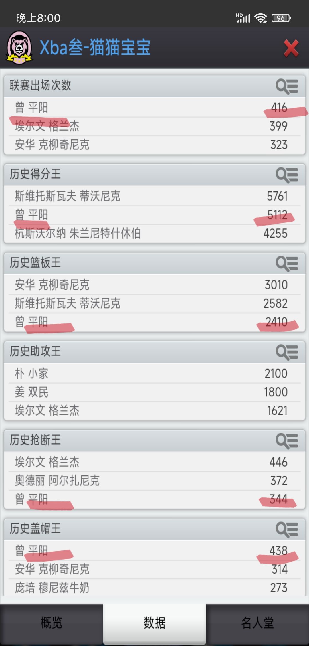 出场第一(416场求超越)、盖帽第一、得分第二、抢断第三、篮板第三。