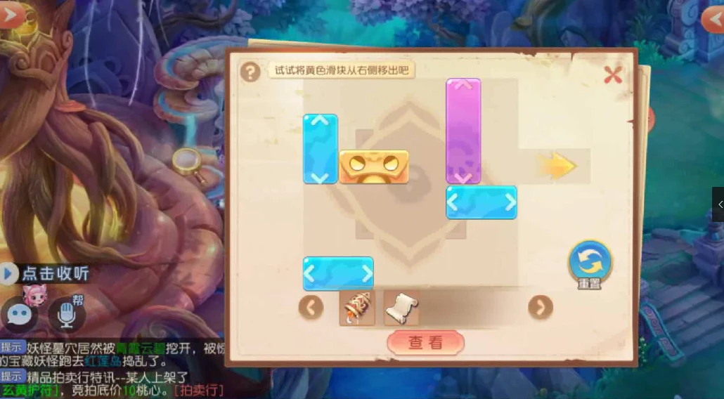 3、回到右边,往地图中间的路走找到第二个放大镜(如图示),解机关~这个也是很好操作的,拉动图示两个方块就行。