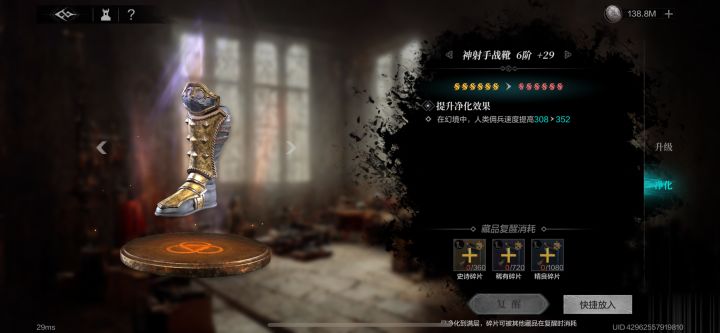 0️⃣红色普通藏品最大的作用是提升军备值(+44841)及升阶被动和净化效果,但从六星金藏品进阶需要360闲散金碎片,720紫碎片,1080蓝碎片。因为地牢3不提供蓝碎片,所以后期奇缺,平民切忌不要乱净化,多做派遣拿蓝箱。