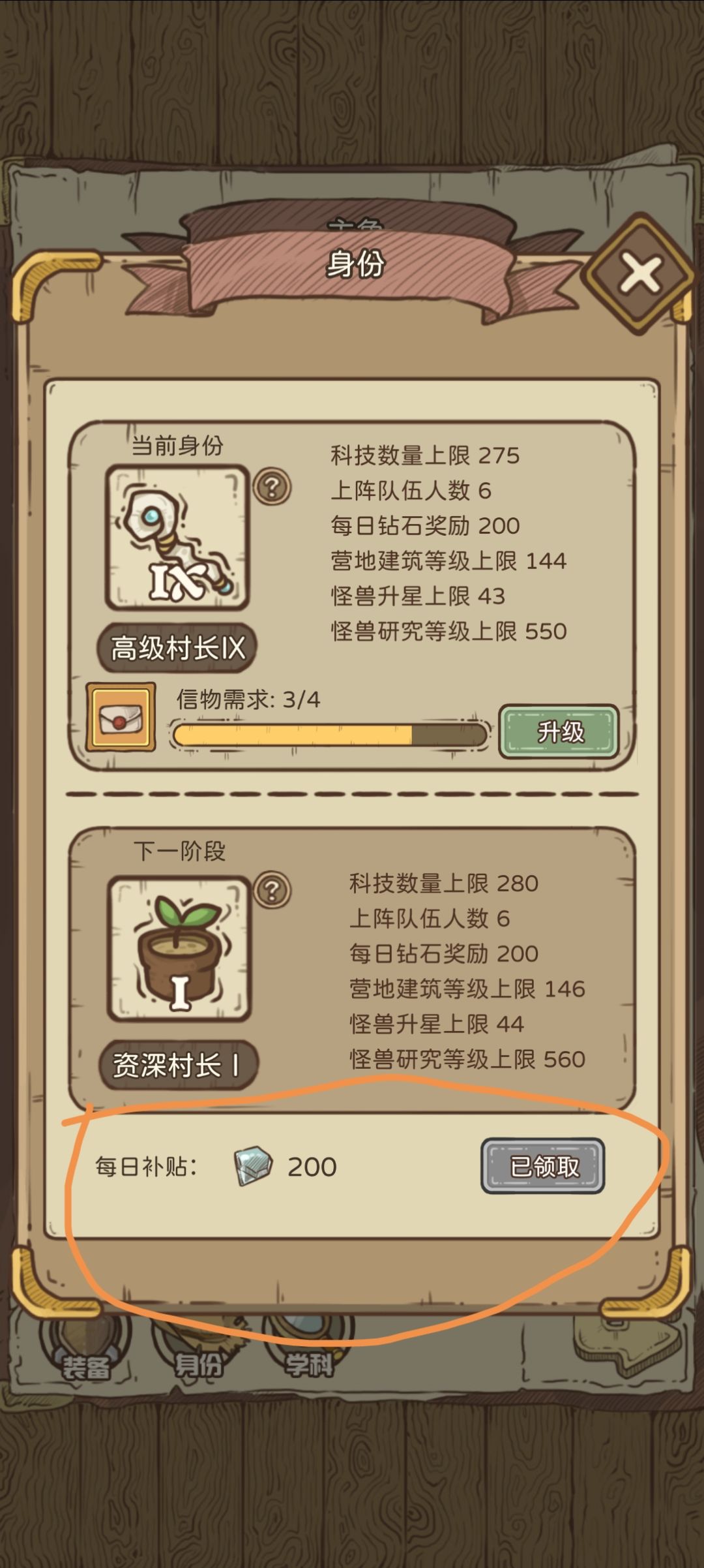 每次身份提升都会重置每日补贴(不是广告那个),别忘了。