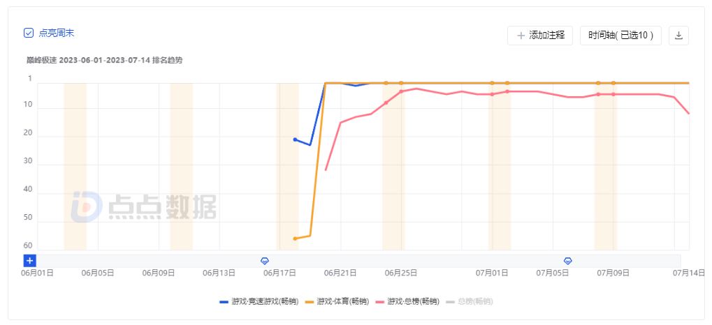写实画风的竞速赛车手游无疑具备机会,但也因为较高的研发准入门槛,相应爆款新品较少。2023年6月,网易《巅峰极速》上线后最高曾到达畅销榜第3名。目前上线近一年,伴随版本更新,排名仍能冲进Top20。而《极品飞车:集结》在获得版号后,自然也备受玩家关注。