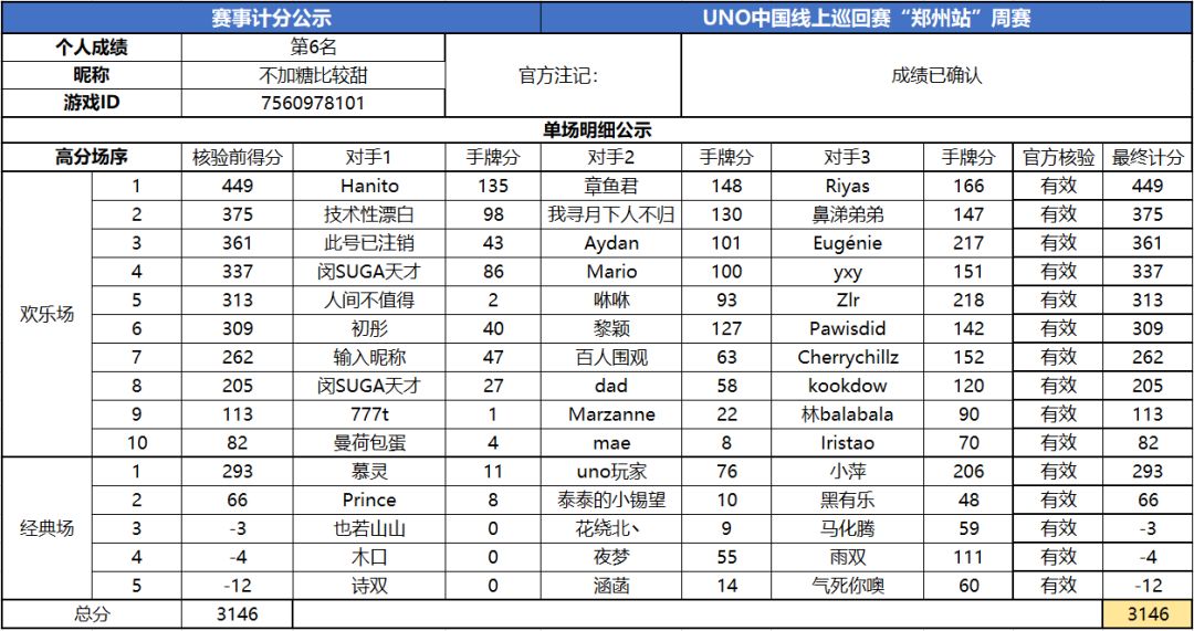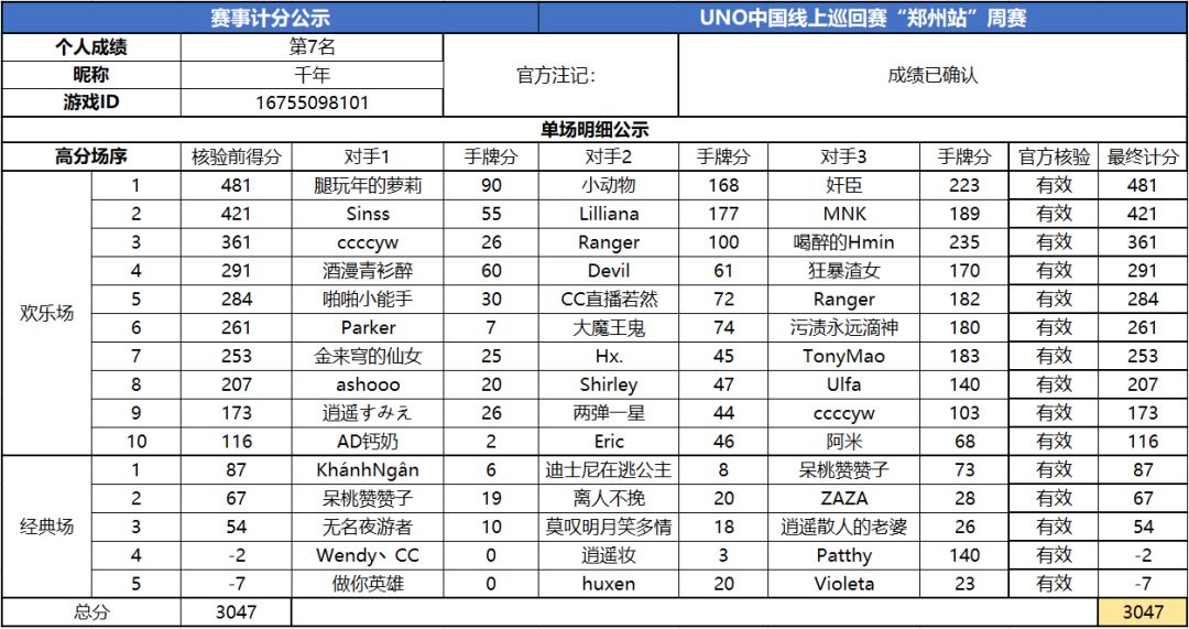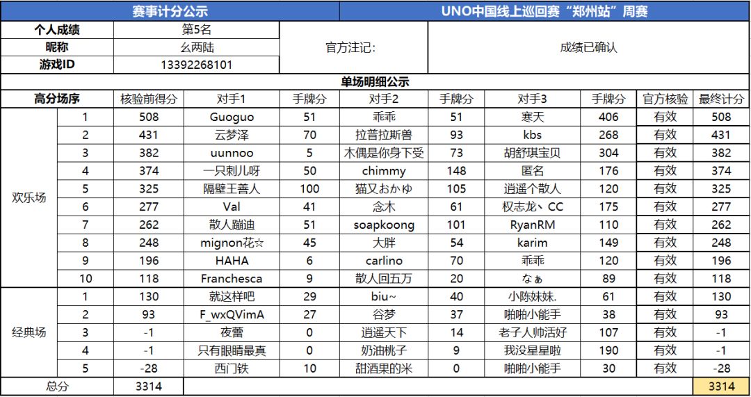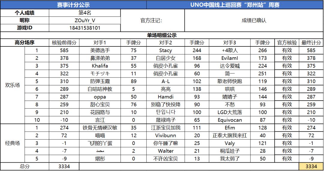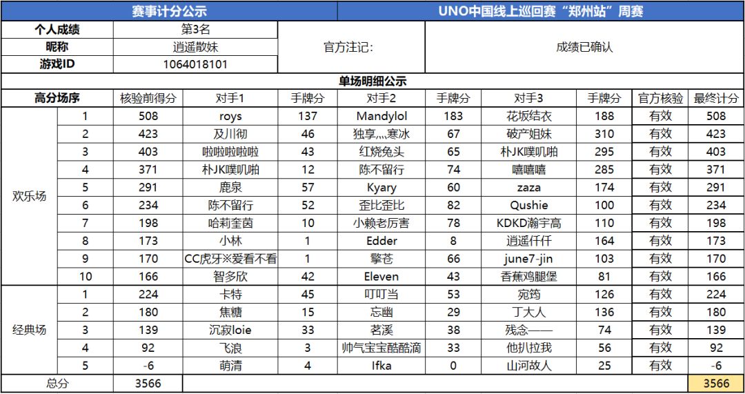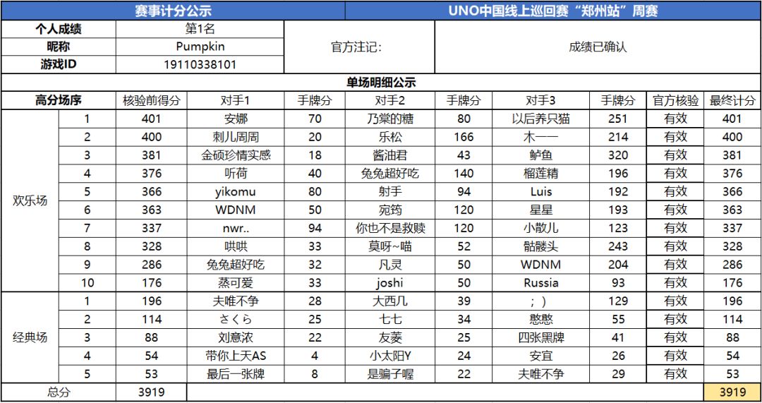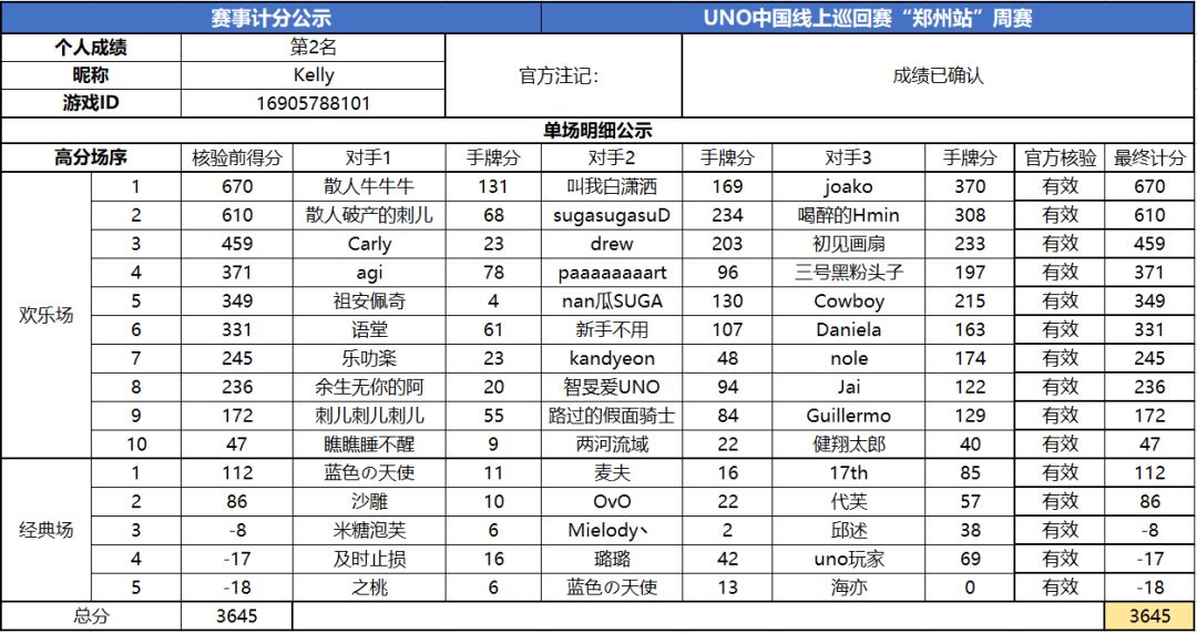 以上就是2020UNO线上巡回赛“郑州站”周赛的战报内容啦,为了保证我们巡回赛的公平公正,根据规则,至少完成10场欢乐场及5场经典场的玩家才会判定完成本站巡回赛,而利用多开或其他违规操作的选手我们也会取消本次巡回赛成绩。