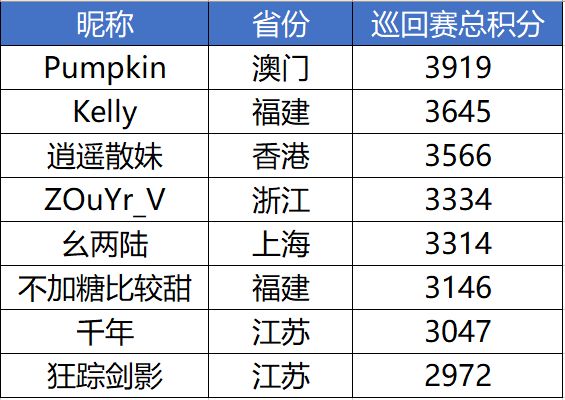 成功夺得本周冠军的,是来自澳门特别行政区的“Pumpkin”!特区玩家夺冠的这一天终于是到来了,凭借3919分的优异成绩,澳门“南瓜”成为了首位拿到巡回赛冠军的特区玩家!虽然澳门玩家不多,但突然冒出一位状元,不知道隔壁香港的玩家们怎么看呢?