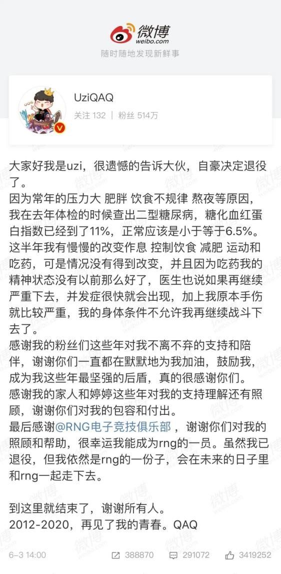 2020年6月3日,他却在微博上突然宣布了因身体原因退役的消息。