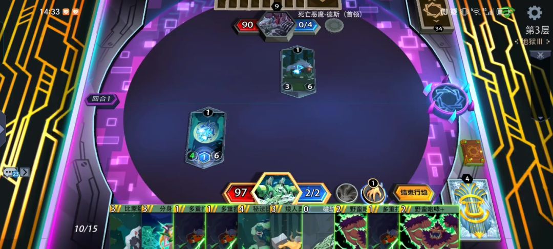 第一回合:宠物项圈拉蘑菇,分身术,能量法球,结束。