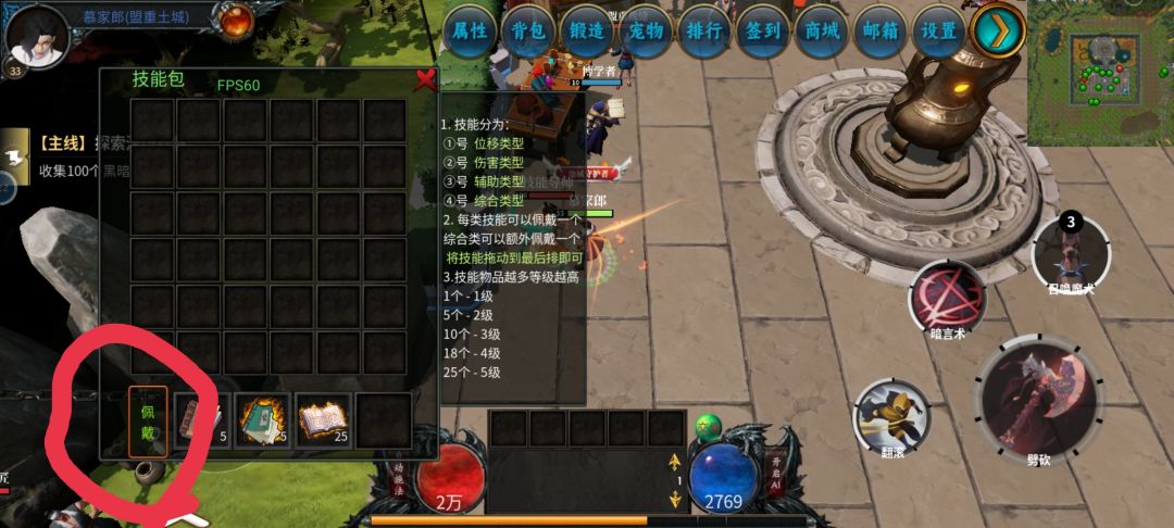 选择技能背包,点击佩戴,才可以使用技能,如图。