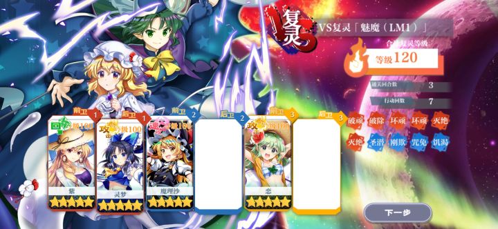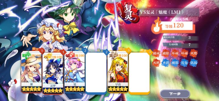 1t:水紫2技能,2号位所有技能,金早苗开2技能、水恋开2和3技能。水紫全体卡带砂糖妹,2号位lw,3号位2p全体卡。