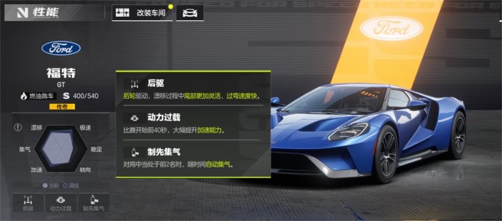 观察六维图可以发现,这辆车的转向属性并不是很差,仅仅是稳定性几乎垫底,但是漂移属性能够弥补稳定不足的情况,可以说在所有短图中这辆赛车就是超越小牛的存在了。由于起步爆发特性过于离谱,因此也就没有了与现实赛车相关的灵感或者元素,直接来看特性作用:第一条动力过载,在紫车上也有出现过,对于紫车来说由于极速的缺失,加速能力的提升有时候无法帮助车手冲出车阵,但是在福特GT上这个问题就不复存在了;第二条特性也很好解释,由于领先赛车无法吃到前车尾流,为了维持领先位置,其它赛车经常需要多卡气,这一特性也是弥补了赛车在第一特性失效之后的劣势,只要没有大失误,名次就能稳稳带回。