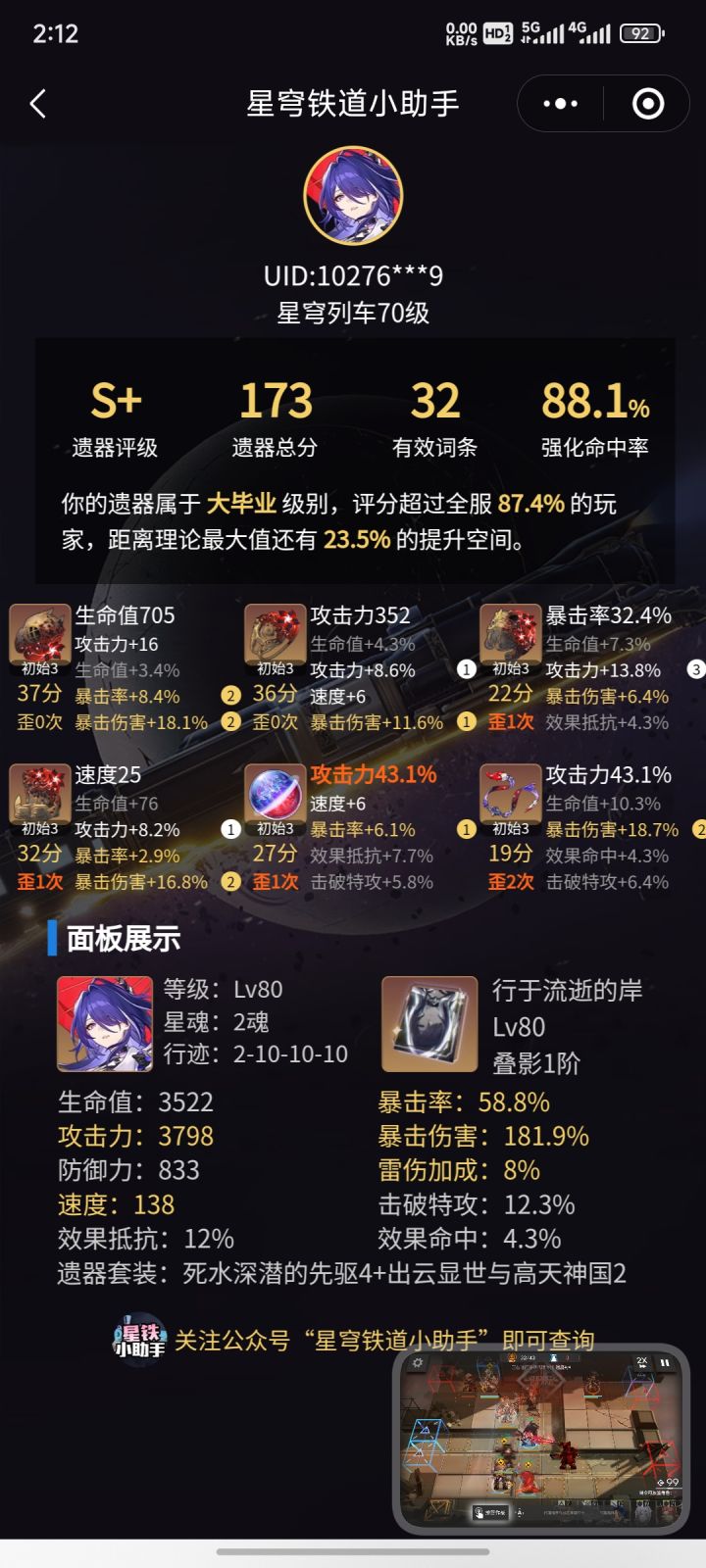 遗器太难刷了,目前就先这样了,看起来爆伤不是很高,那是因为均衡了一下攻击力和速度,没有花火,还是堆一下速度更能发挥2命的意义。暴击率完全够的,因为一命18暴击率,死水4,内圈12,符玄12,都是不在面板上的。