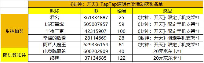 恭喜以上将军大人获奖,还请名单内的将军大人在开奖后的7个工作日内即4月26号之前,加入《封神:开天》玩家交流群:860840777,并私聊噗噗酱等客服提供tap账号截图信息核对和登记奖品寄送信息。