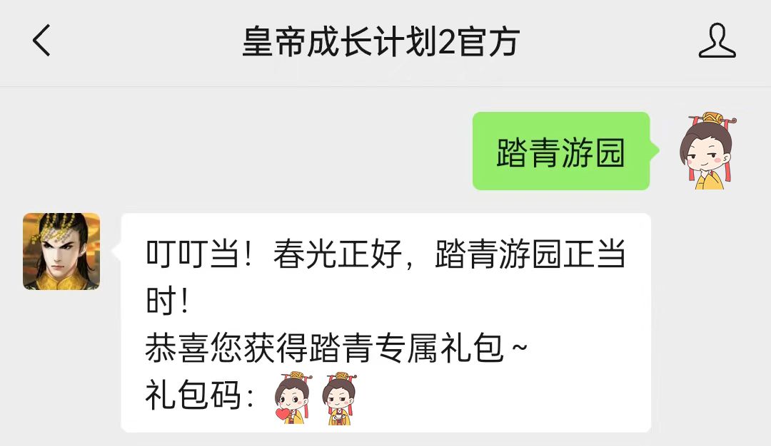 参与方式:活动期间,在"皇帝成长计划2官方"公众号内回复“踏青游园“,即有机会获得踏青礼包码~