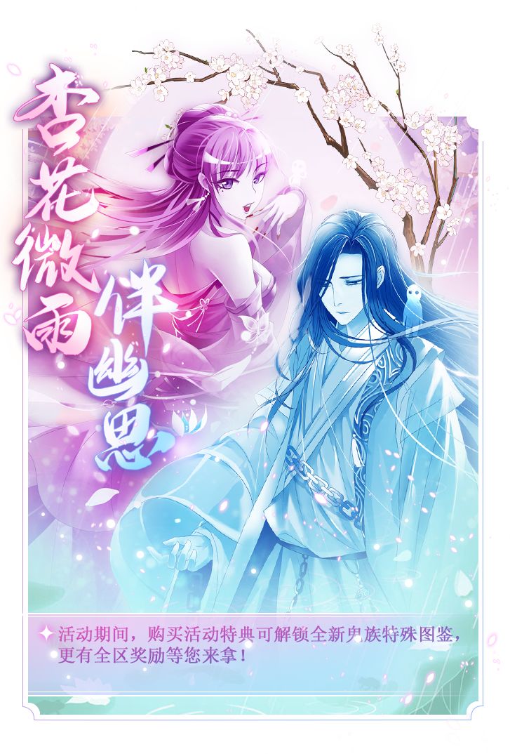 1、4月4日00:00至4月30日23:59期间,参与“杏花微雨伴幽思”限时活动,有机会获得“芳魂夜奏图鉴碎片”、“伶童符催图鉴碎片”、“红纱怨啼图鉴碎片”等稀有道具奖励