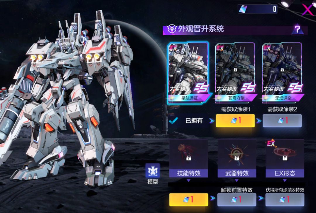 本次外观晋升系统升级后,除了原系统的“涂装”与“EX形态”,将新增“技能特效”与“武器特效”晋升选项。
