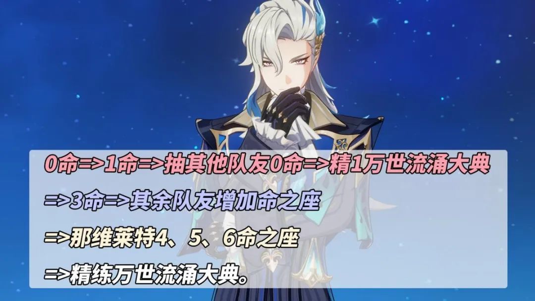 【想增为龙王增配置】0命=>1命=>抽其他队友0命=>精1万世流涌大典=>3命=>其余队友增加命之座=>那维莱特4、5、6命之座=>精练万世流涌大典。队友的话,例如枫原万叶、芙宁娜,至于白术倒也不是那么必要,夏洛蒂都够用了。