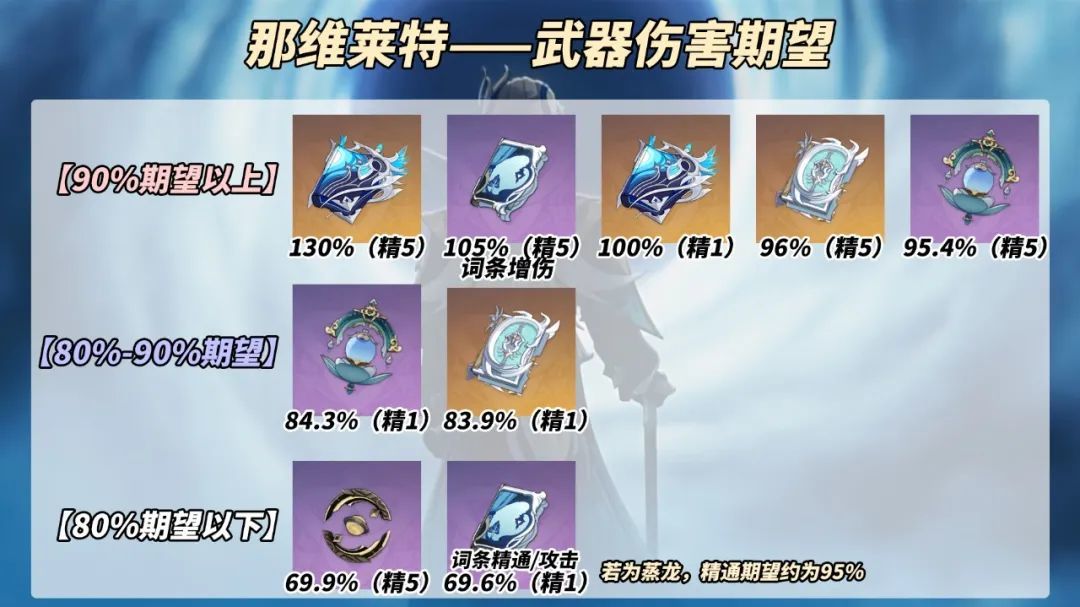 挑选了目前那维莱特较为热门的武器进行预估,得到以下数据:【90%期望以上】精5万世流涌大典130%(限定祈愿)、精5流浪乐章‘增伤词条’105%(常驻祈愿)、精1万世流涌大典100%(限定祈愿)、精5四风原典96%(常驻祈愿)、精5遗祀玉珑95.4%(纪行宝匣)。流浪乐章有覆盖率、随机性问题,不是太推荐【80%-90%期望】精1遗祀玉珑84.3%(纪行宝匣)、精1四风原典83.9%(常驻祈愿)。【80%期望以下】精5试作金珀69.9%(锻造武器)、精5流浪乐章‘攻击/精通词条’69.6%(常驻祈愿)。