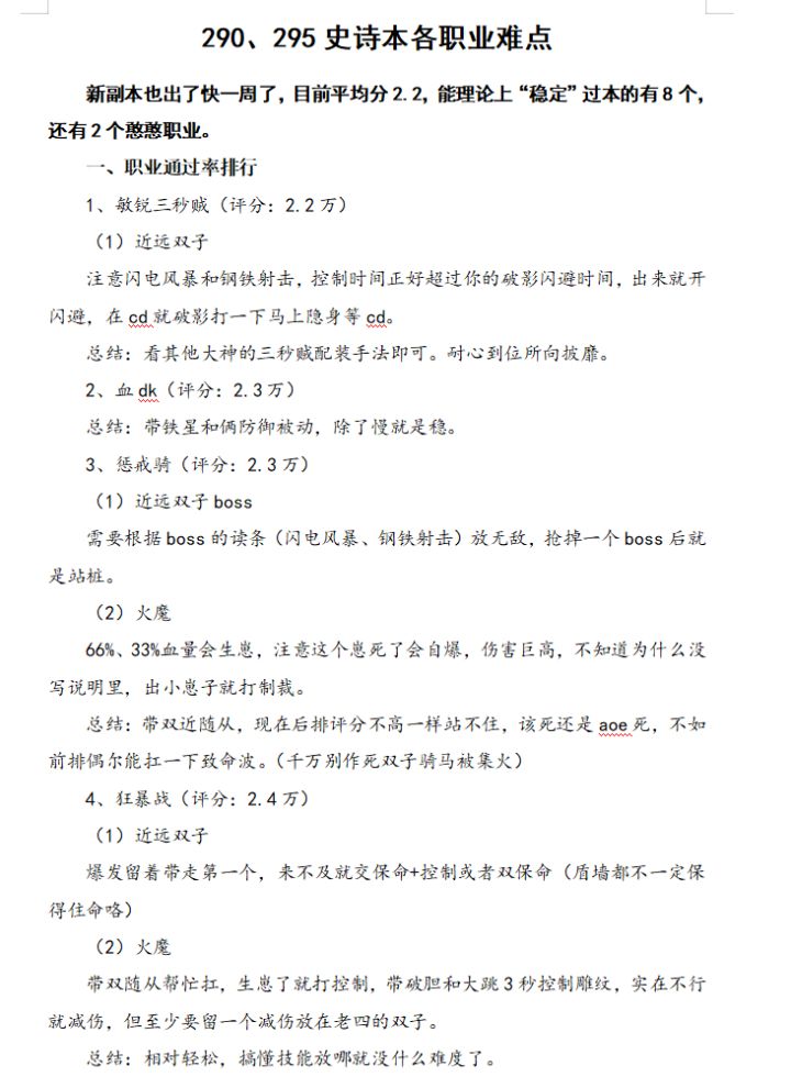 290、295史诗本各职业难点