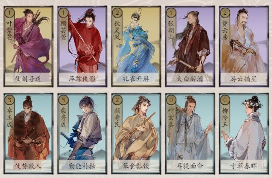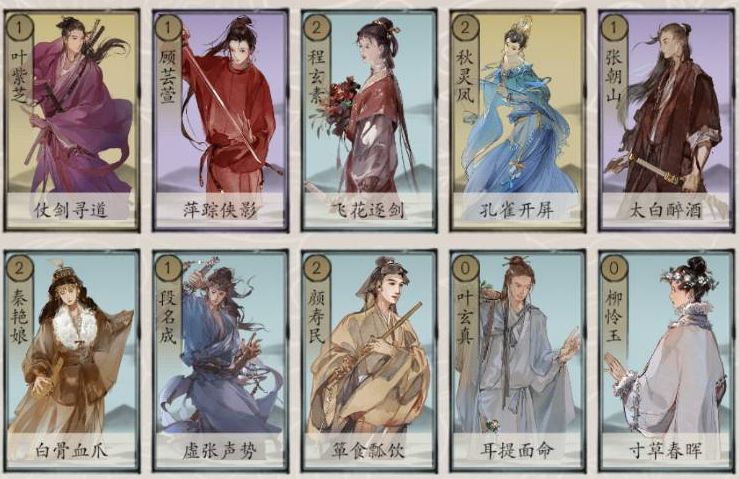 【初始江湖】叶紫芝、顾芸萱、秋灵凤、张朝山、史存孝、雷奉宣、金良玉、颜寿民、叶玄真、柳怜玉。PVE推关卡组,零成本初始卡组。