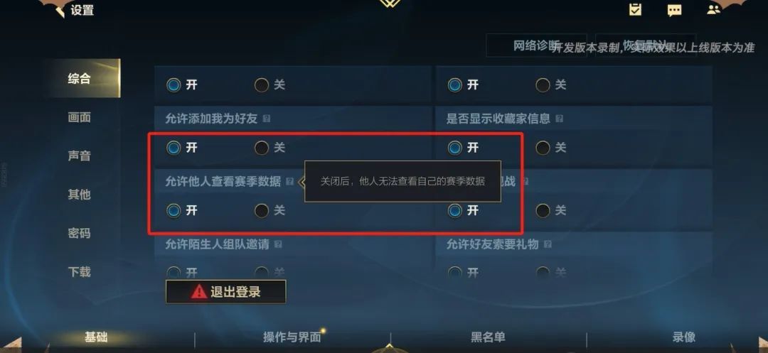 新版本在设置功能中,优化增加了隐私性开关。关闭后,其他召唤师将无法查看该账号赛季数据。