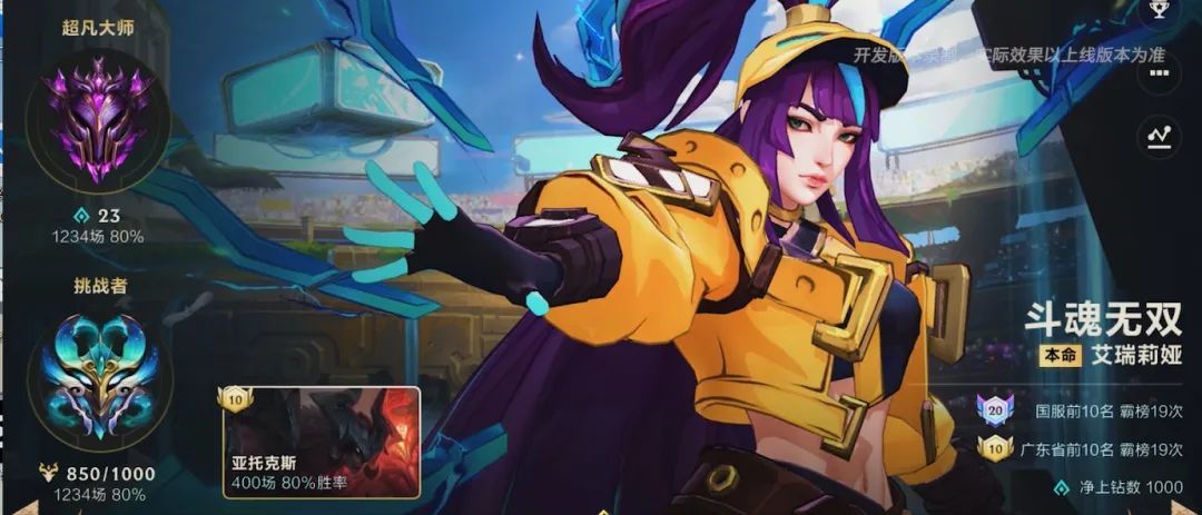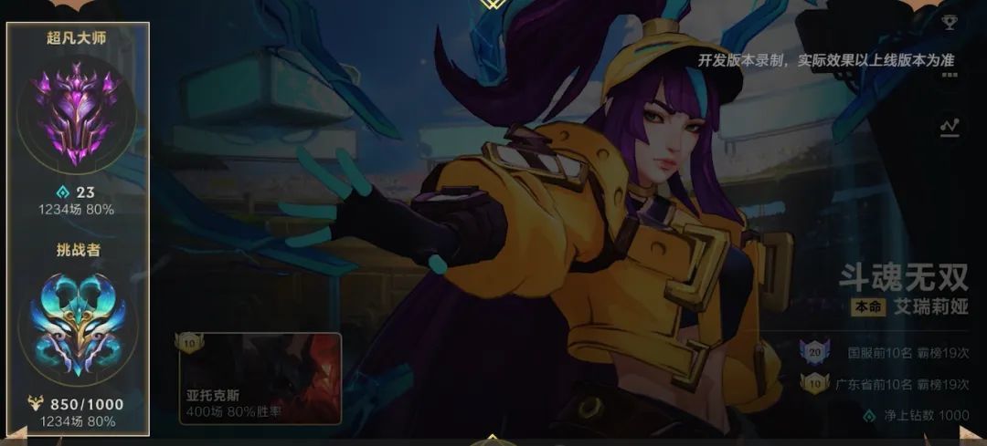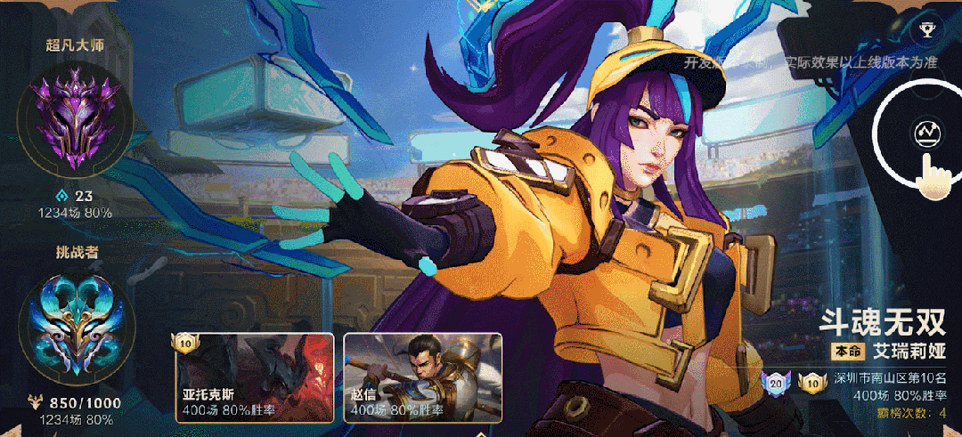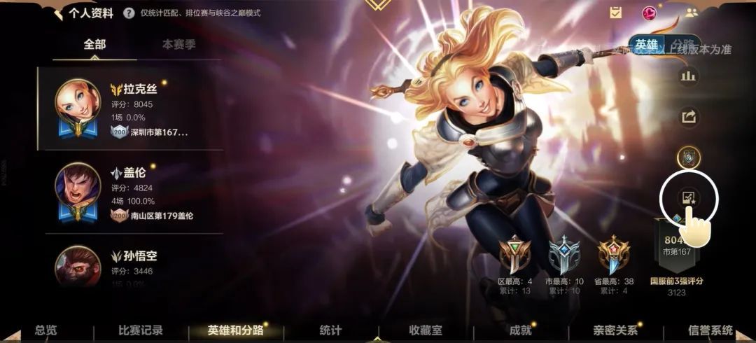 若对应英雄达到过省级以上区域排名,则会出现相应的排名标识。英雄高光内容包括上榜次数,净上钻数以及场次与胜率等。