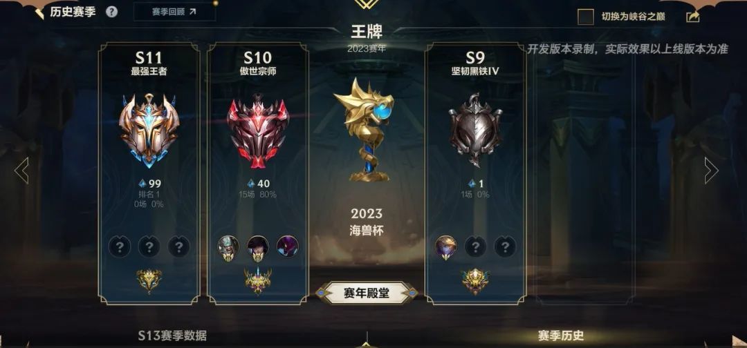 在赛年为主体的赛季历史中,点击赛季,即可展开所选赛季详情页。除此之外,点击赛年殿堂按钮,还可展开赛年殿堂页面。
