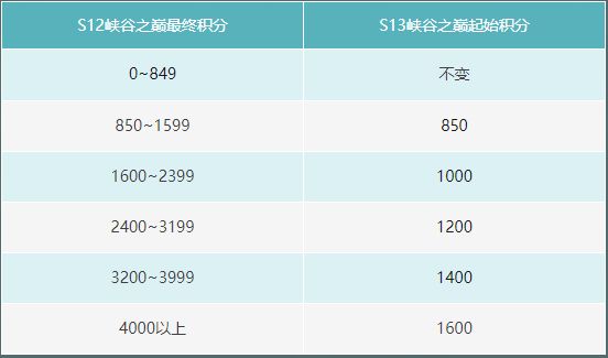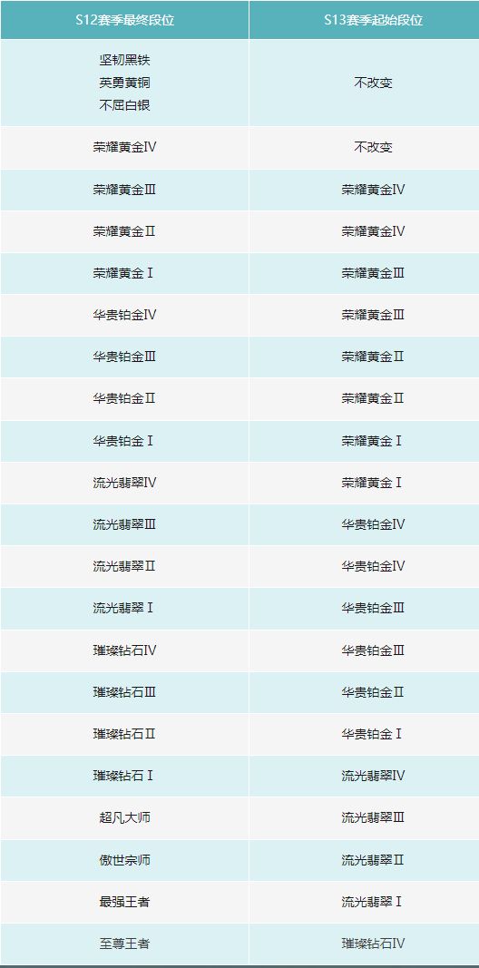 新赛季的起始段位将取决于S12赛季结束时的最终段位,详情如下: