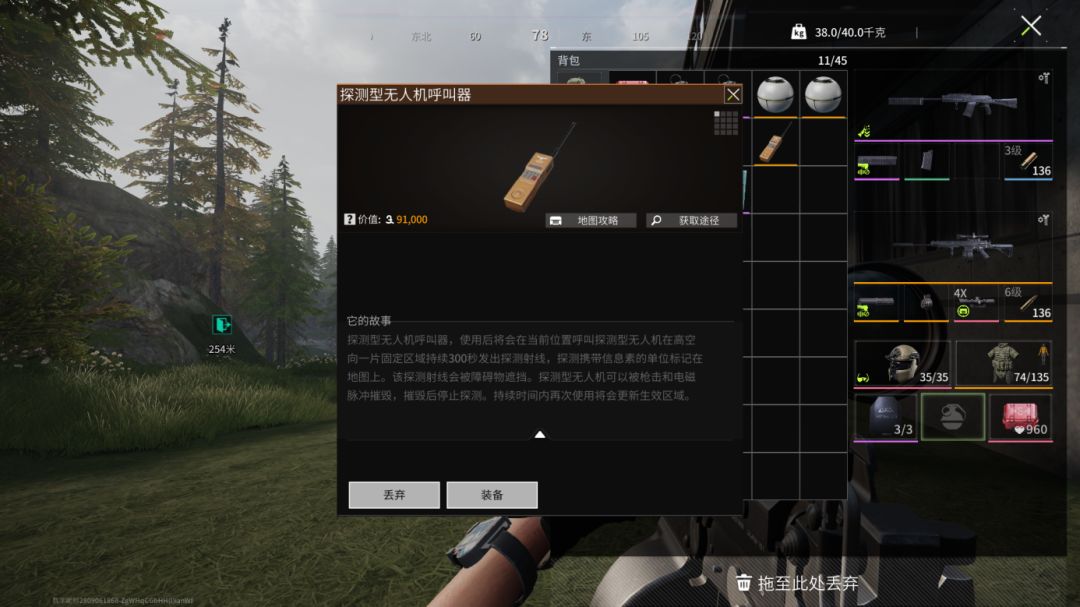 探测型无人机会飞在天上,大范围对下方进行探测,敌人不在掩体内就会暴露,所以适合在上方开阔的地区使用,最适合的就是秋山、南风港了,比如我们在南风港临海仓库的时候,放一个无人机,可以第一时间知道对手的动向。