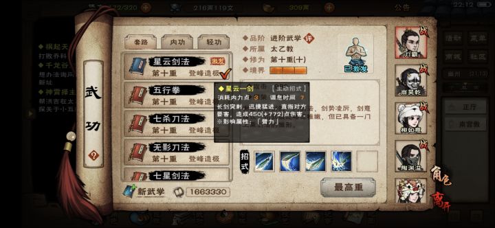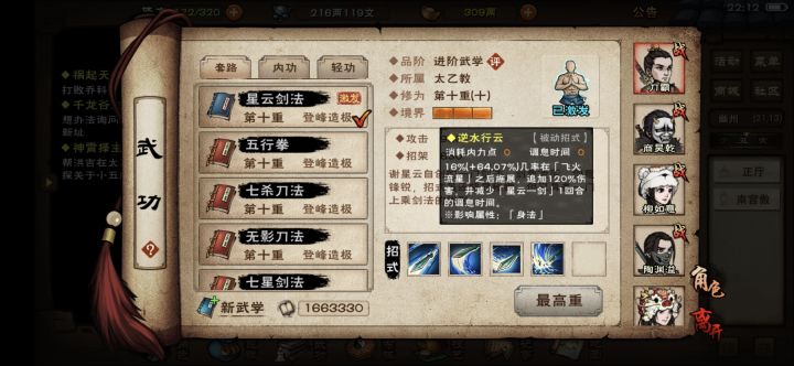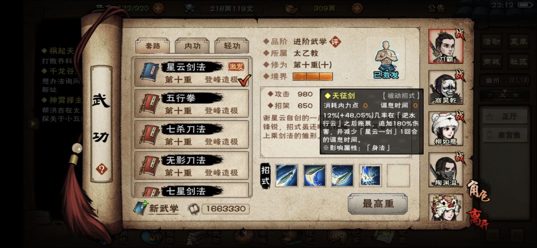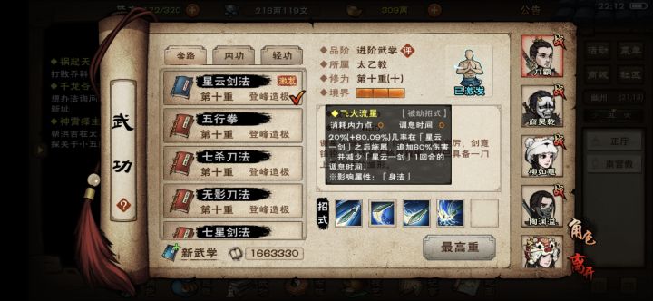 接下来我说一下没进剑王阁的六扇门玩家秘技怎么搭配。小星云是进阶剑法,所以攻击力低,可以带柳絮柔劲提升攻击力和穿甲。带铁臂功+5%破招架和30臂力。九幽引提升速度跟攻击。最后一个秘籍可以带剑法类进一步提升攻击力的或防御类的提升生存能力(我带了归元剑意减调息时间)。
