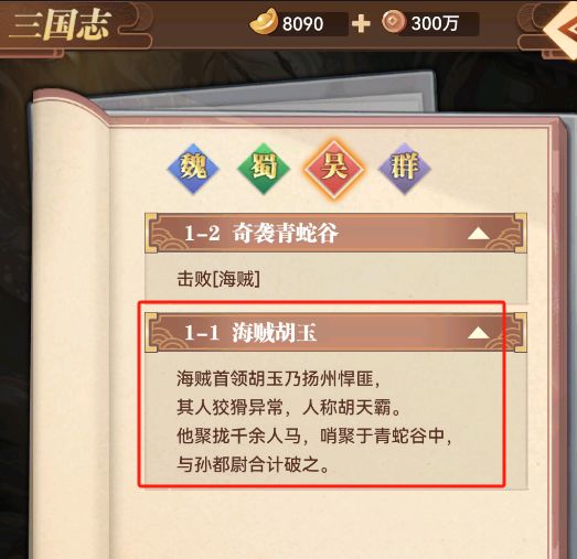 主线任务完成吴国篇,1-1海贼胡玉后开启前置条件。