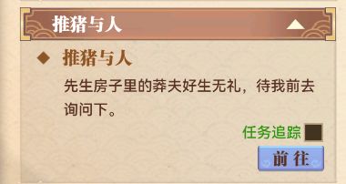 角色完成游历之书任务后,前往水镜庄(荆州-鹿门山-水镜庄),接取游历任务:推猪与人