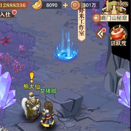 进入鹿门山秘窟,可看到虾米工作室传送阵(需完成熊大仙任务后可进入)