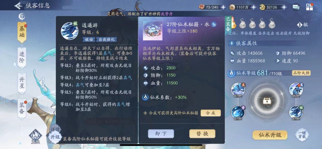 逍遥自在,游天下以自得,在行动结束后,李逍遥获得1层真气,可叠加5层,不可被驱散,持续至战斗结束等级2:叠至5层时,所有攻击无视目标防御30%
