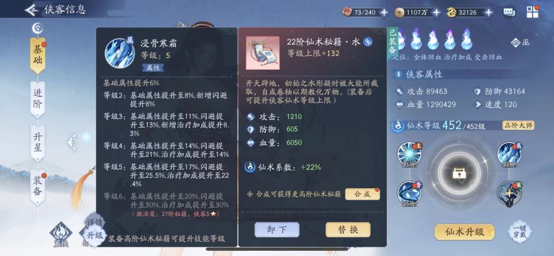 点评:专属仙术1是神技,叠加27普攻仙术,一次道运就可以给两个侠客提供10%减伤,一回合要是3次道运就是30%的叠加,而且治疗都是血量最低的侠客,给他们加减伤就是保命,对于pvp持久战和打神魔boss的前排保命,水雪见没有任何的治疗压力。