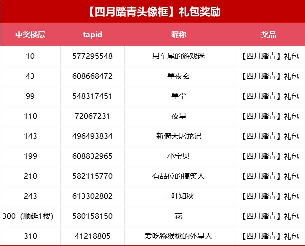 活动结束后,前50位回帖楼层结尾为10、43、99的少主将可以获得【四月踏青】礼包一个(礼包码中必含【麦浪飘香】绝版头像框)。