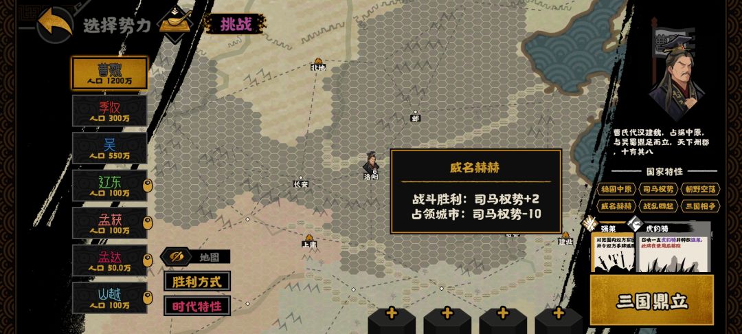曹魏占据中原,地盘是最大的。每回合选择发展会加司马权势。占领城市会减10权势,战斗胜利加2。
