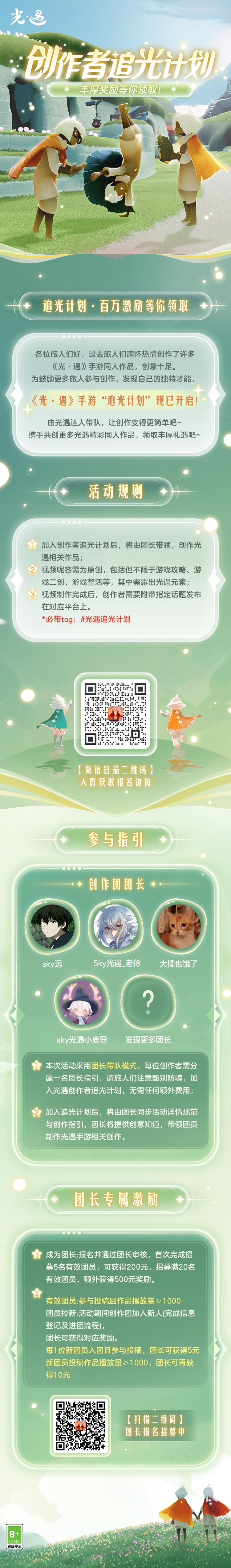 ✦ 专属礼遇:长期举办创作激励活动,获取专属团奖励金,还有光遇周边福利掉落