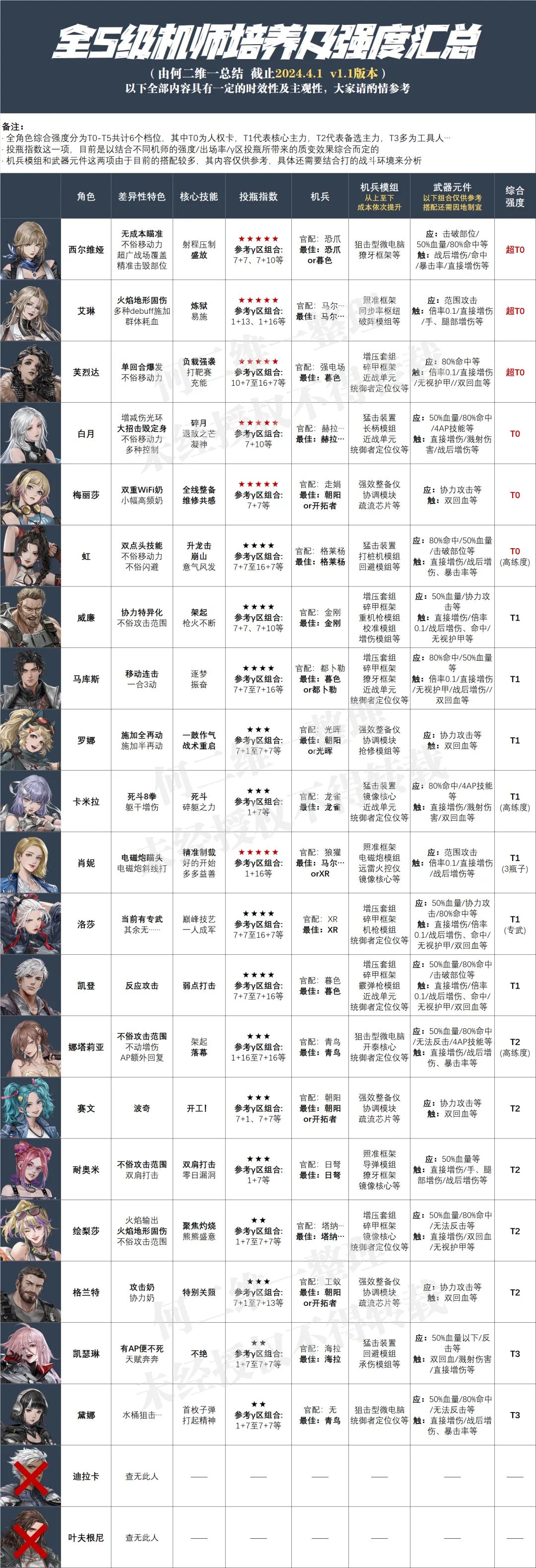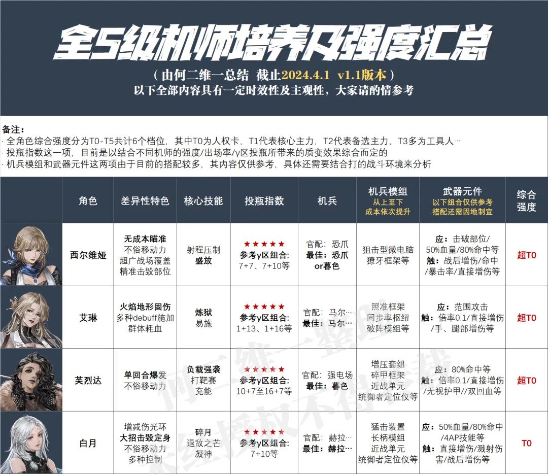 今天是愚人节,官方给大家开了个小小的玩笑,但这威廉的皮肤玩笑归玩笑,不过其实官方还真有做皮肤的打算,并且不久之后大家应该就会体验到了,当然咱们今天的攻略维一是为大家汇总当前版本之下的全S级角色的差异性特色、核心技能、投瓶相关、机兵搭配、模组、武器元件以及综合强度等内容的一图流汇总攻略,希望能给大家带来一些小小的帮助。