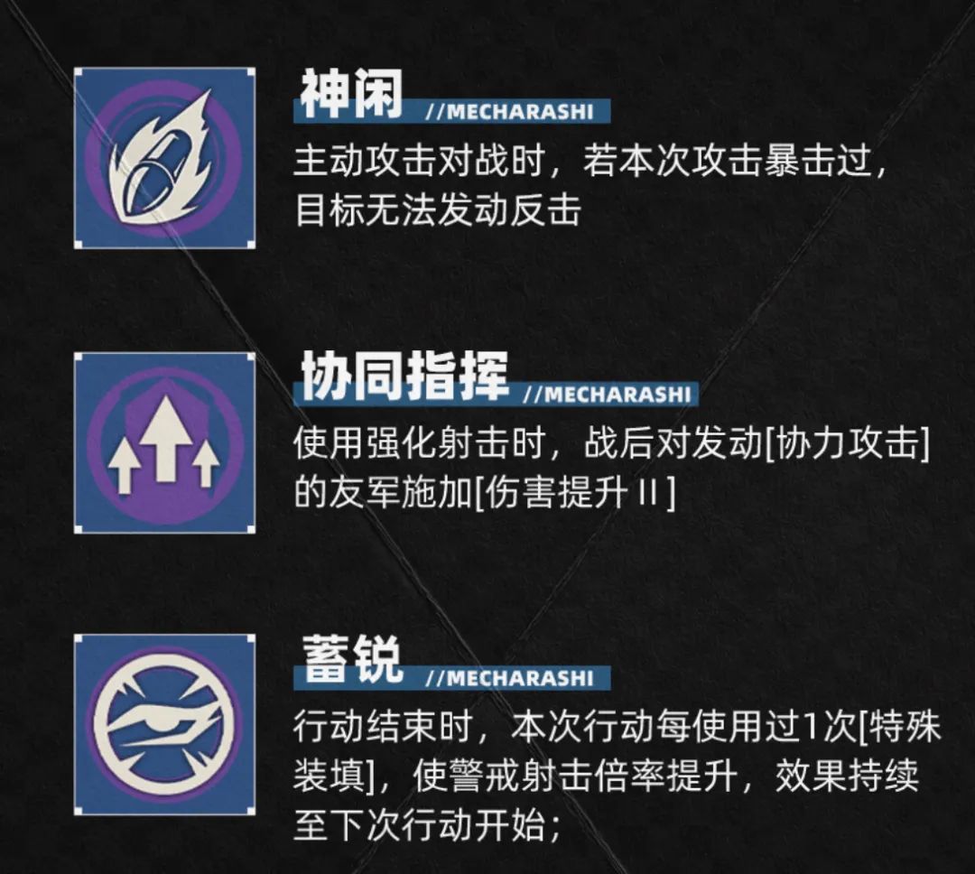 然后三个被动技能就有点意思了,在今天攻略的标题中维一就已经提到了,凯莉的上线很大程度上便意味着艾莉森的下课,而在这三个被动中的【协同指挥】技能,便是一个可以为友方提供增伤能力的技能,大家也都知道艾莉森其实也有一定的增伤辅助效果,只是她们俩实现增伤的逻辑略有不同罢了。