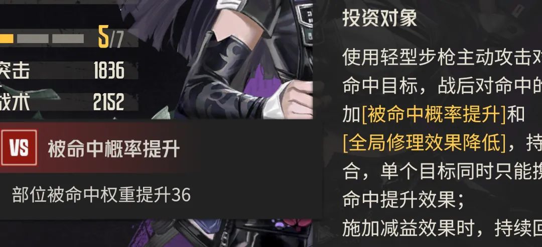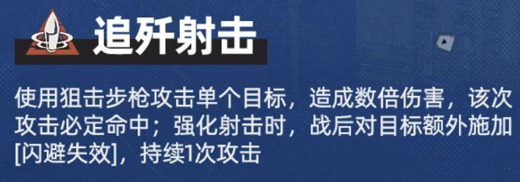 接着是凯莉的主动技能,第一个【追歼射击】的优势维必定命中,外加一个【闪避失效】的debuff效果,属于一个对策卡类型的输出技能。