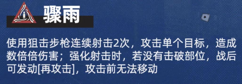 接着是【骤雨】这个可以连续输出的技能,前置条件维“没有击破部位”,这个技能的设计思路其实很简单,那便是因为当前的狙击手在打boss类敌人的时候都显得较为乏力,所以官方也就以此为出发点设计了这个技能,大家应该也能脑补到其原因。